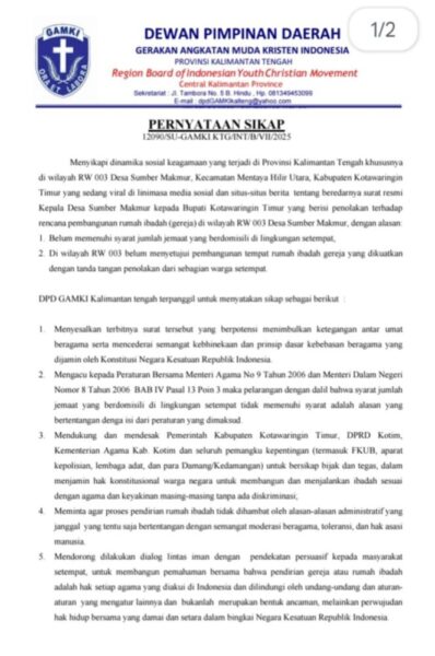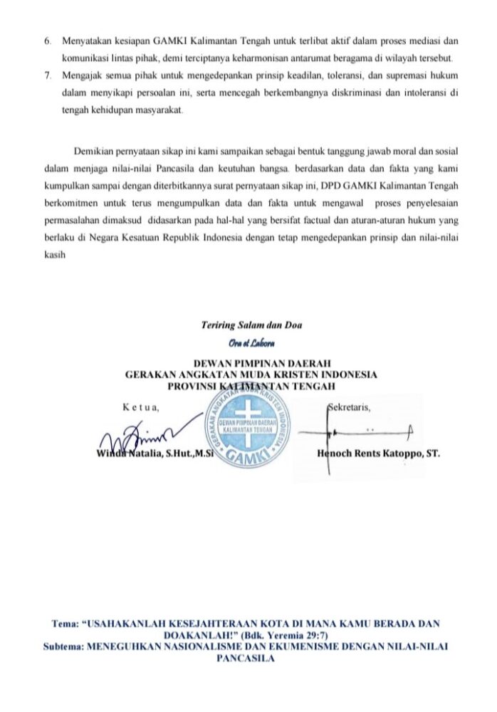 Terkait itu, melalui rilis resminya yang diterima media ini, Selasa (22/7/2025), Dewan Pimpinan Daerah Gerakan Angkatan Muda Kristen Indonesia (DPD GAMKI) Provinsi Kalteng terpanggil untuk menyatakan sikap sebagai berikut: