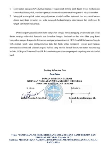6. Menyatakan kesiapan GAMKI Kalimantan Tengah untuk terlibat aktif dalam proses mediasi dan komunikasi lintas pihak, demi terciptanya keharmonisan antarumat beragama di wilayah tersebut.