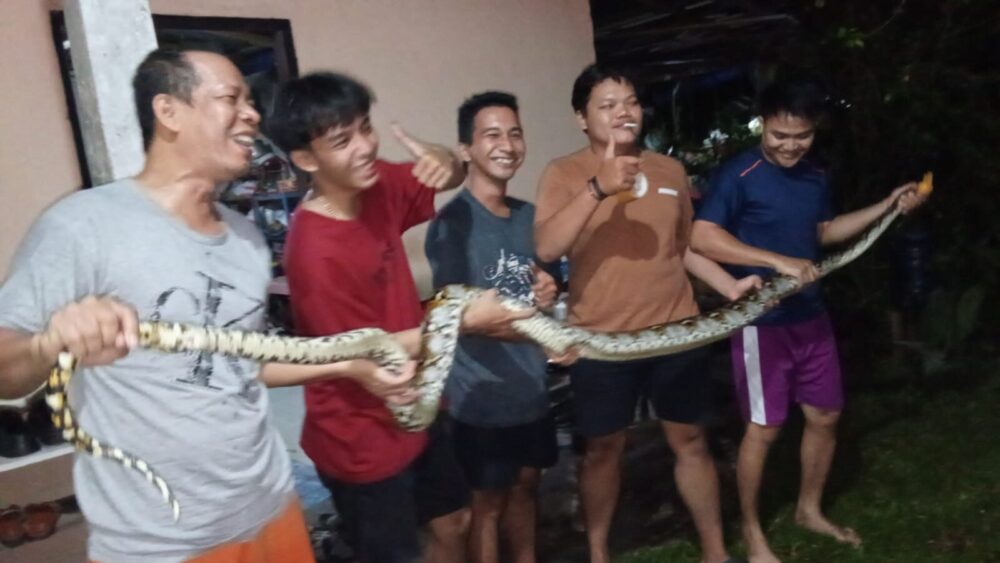 Palangka Raya, Betang.tv — Warga RT 18 RW 6 Kelurahan Menteng, Kecamatan Jekan Raya, Kota Palangka Raya berhasil mengevakuasi seekor ular piton sepanjang sekitar 3,5 meter yang masuk ke permukiman, Minggu malam (21/9/2025).