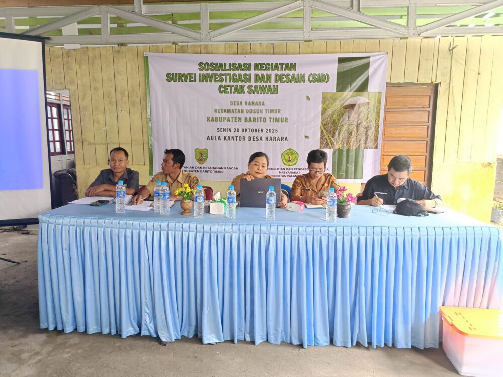 Tamiang Layang, Betang.tv – Dinas Pertanian dan Ketahanan Pangan (DPKP) Kabupaten Barito Timur (Bartim) bersama Lembaga Penelitian dan Pengabdian kepada Masyarakat (LPPM) Universitas Palangka Raya (UPR) memaparkan hasil Survei Investigasi dan Desain (SID) Cetak Sawah di Balai Desa Harara, Senin (20/10/2025).