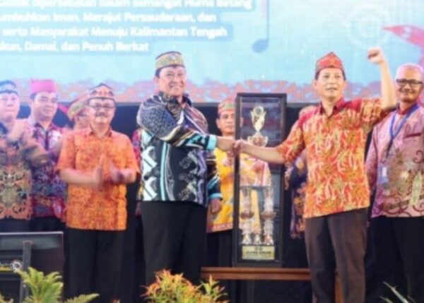 Wakil Gubernur Edy Pratowo, berkesempatan menyerahkan Trophy bergilir Pesparani Katolik I kepada Kontingen Kota Palangka Raya sebagai Juara Umum yang diwakili Ketua LP3KD Kota Indra Cahya.
