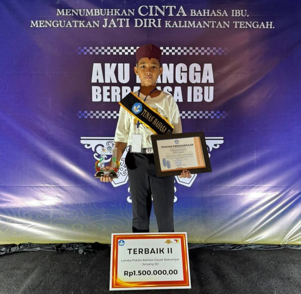 Aditya Pratama, siswa kelas VI, berhasil meraih Juara II Lomba Pidato Bahasa Dayak Bakumpai tingkat SD pada ajang Festival Tunas Bahasa Ibu (FTBI) 2025 yang diselenggarakan oleh Balai Bahasa dan Budaya Provinsi Kalimantan Tengah (Kalteng).