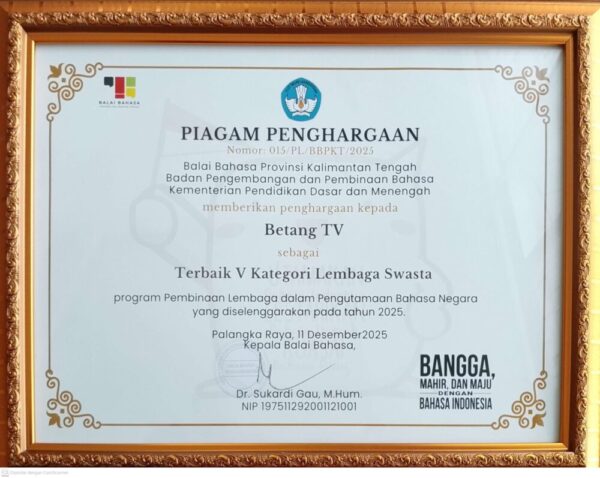 Palangka Raya, Betang.tv – Media online Betang.tv menerima penghargaan penggunaan Bahasa Indonesia yang baik dan benar tahun 2025 dari Balai Bahasa Provinsi Kalimantan Tengah (Kalteng). Penganugerahan tersebut berlangsung di Gedung Pertemuan Balai Bahasa Kalteng, Kamis (11/12/2025).