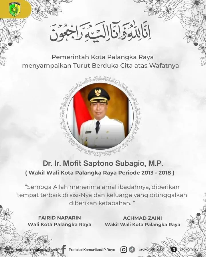 Palangka Raya, Betang.tv – Duka mendalam menyelimuti Kota Cantik. Salah satu putra terbaik yang pernah menorehkan jejak penting dalam roda pemerintahan, Dr Ir Mofit Saptono Subagio MP, Wakil Wali Kota Palangka Raya Periode 2013–2018, berpulang ke Rahmatullah.