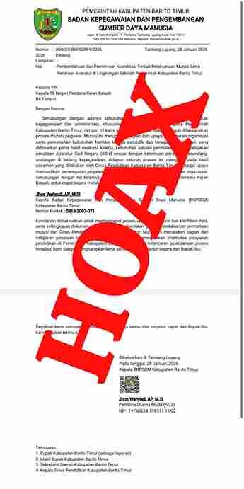 Tamiang Layang, Betang.tv — Badan Kepegawaian dan Pengembangan Sumber Daya Manusia (BKPSDM) Kabupaten Barito Timur (Bartim) memastikan surat pemberitahuan dan permintaan koordinasi mutasi aparatur di lingkungan sekolah yang beredar luas dalam bentuk PDF adalah tidak benar alias hoaks.