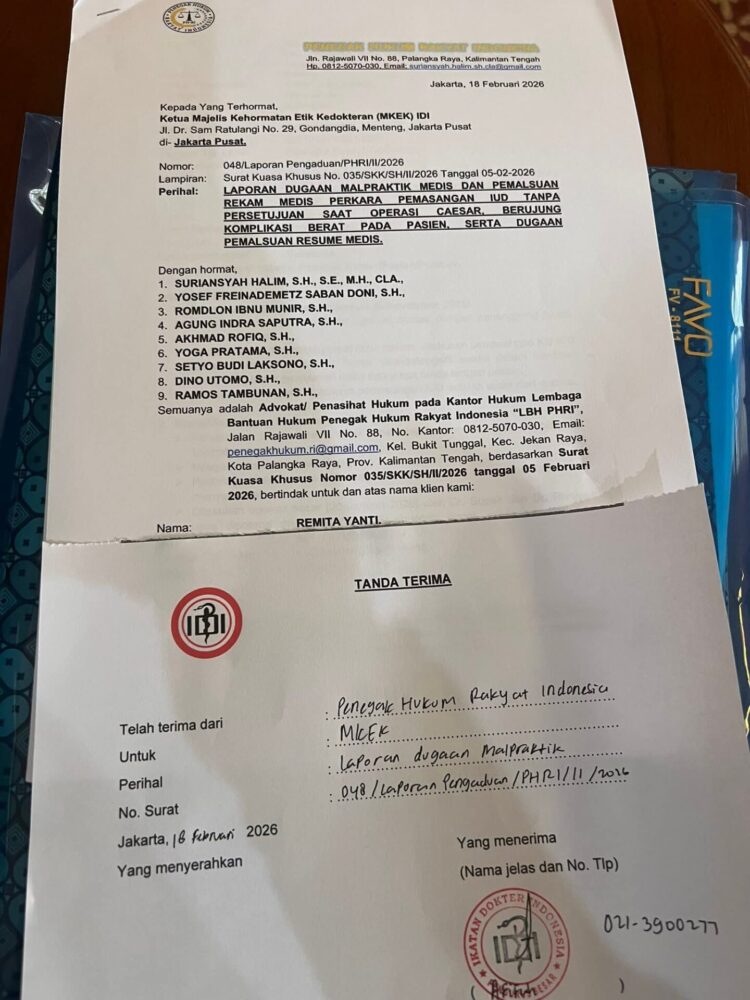 Palangka Raya, Betang.tv – Kuasa hukum seorang ibu muda berinisial RY resmi melaporkan dugaan malapraktik dan pemalsuan rekam medis dalam tindakan pemasangan alat kontrasepsi dalam rahim (IUD) tanpa persetujuan saat operasi caesar ke Majelis Kehormatan Etik Kedokteran (MKEK) pusat di Jakarta, Rabu (18/2/2026).