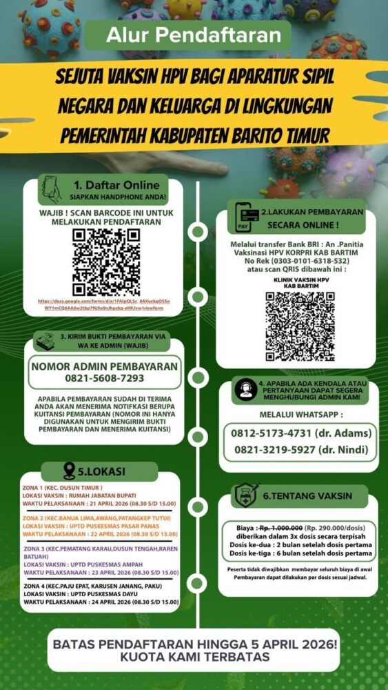 Bupati Bartim, M Yamin, secara tegas mengimbau ASN perempuan beserta kerabatnya agar tidak menyia-nyiakan kesempatan ini. Menurutnya, vaksinasi HPV merupakan langkah strategis dalam mencegah kanker serviks atau kanker leher rahim yang masih menjadi salah satu penyebab kematian tertinggi pada perempuan.