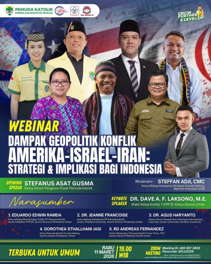 Palangka Raya, Betang.tv, – Ketegangan geopolitik yang melibatkan Amerika Serikat, Israel, dan Iran menjadi perhatian serius berbagai negara, termasuk Indonesia. Menyikapi dinamika tersebut, Pemuda Katolik Komda Kalimantan Tengah menggelar webinar nasional bertajuk “Dampak Geopolitik Konflik Amerika–Israel–Iran: Strategi dan Implikasi bagi Indonesia.”