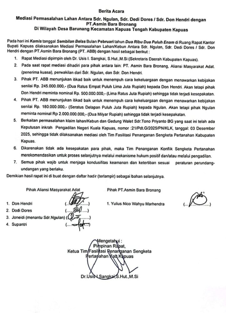 Namun dalam pembahasan terungkap bahwa sebelumnya Tono Priyanto telah lebih dulu menempuh jalur hukum dengan mengajukan gugatan perdata terhadap PT Asmin Bara Bronang dan empat pihak lainnya. Mereka yang turut digugat yakni mantan Camat Kapuas Tengah, Kepala Desa Barunang, Ketua RT Dusun Tumbang Mamput, serta seorang warga Desa Barunang.